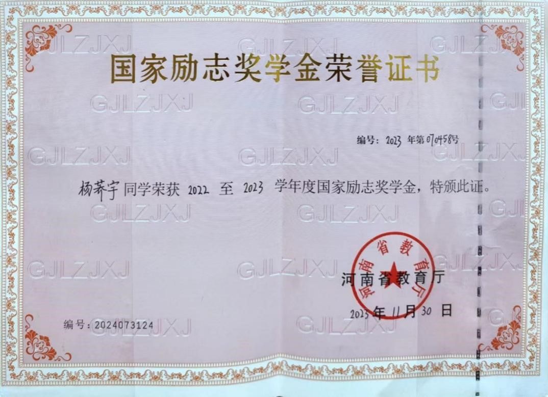 杨荞宇始终以高度的自律精神投入学习。2022-2023学年第一学期学分绩点达4.13,第二学期4.02,连续两年获得国家励志奖学金,并荣获“今年会官网三好学生标兵”、“今年会官网文明学生”等多项荣誉。她始终相信,知识能够改变命运,奋斗终将照亮前行的路。
