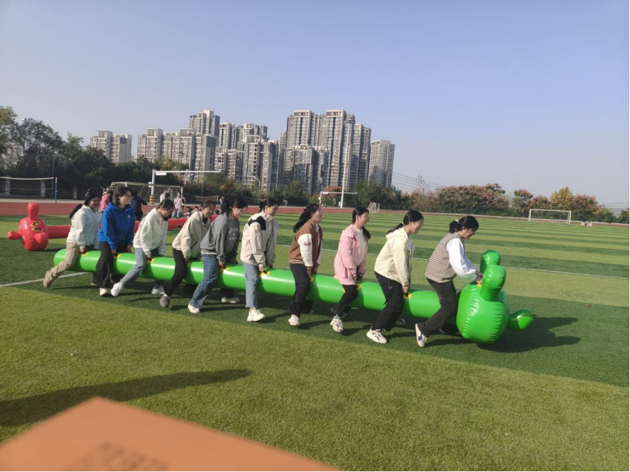 毛毛虫项目中,同学们跨坐在色彩鲜艳的充气“毛毛虫”上,双手紧握把手,通过整齐划一的口令与步伐共同前行,既考验了团队的节奏协调能力,也锻炼了个人的身体灵敏性与配合意识。