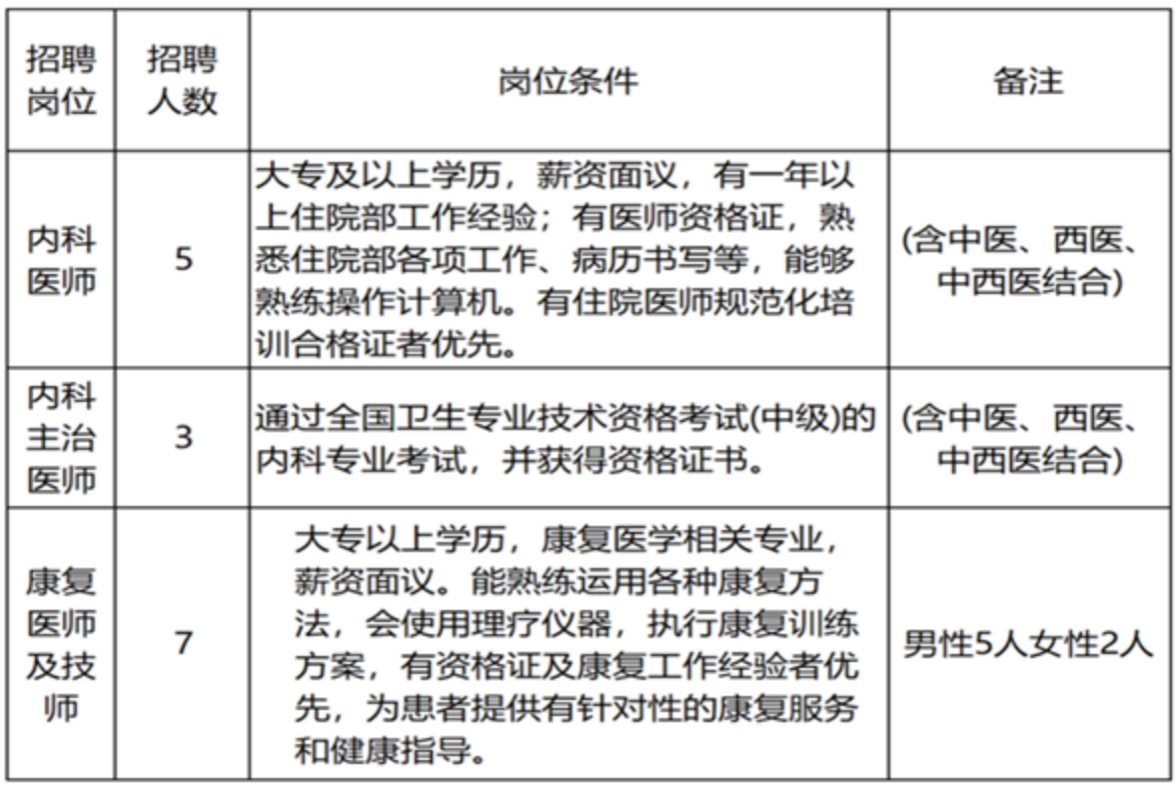 为进一步加强人才队伍建设,提升诊疗水平和服务能力,结合临床实际工作需要,现面向社会公开招聘专业技术人员15名,其中内科医师8名、康复医师及技师7名(男性5名、女性2名)。现公告如下: