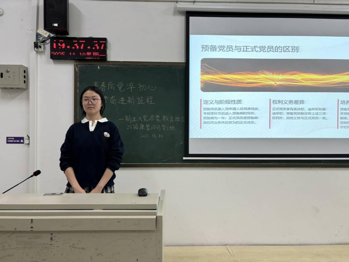 11月10日晚自习期间,2025级各班级在团支书主持下集中开展“青春向党 奋斗强国”主题班会。各班依托专题培训所学内容与《入党小知识》学习材料,通过PPT宣讲、红色影片展播、党史故事分享等形式,系统回顾中国共产党百年光辉历程,深刻阐释伟大建党精神的时代价值。班会结束后,学院统一组织入党知识问卷测试。结果显示,新生对党的性质宗旨、入党条件及程序等核心知识掌握率显著提升,达到预期目标。