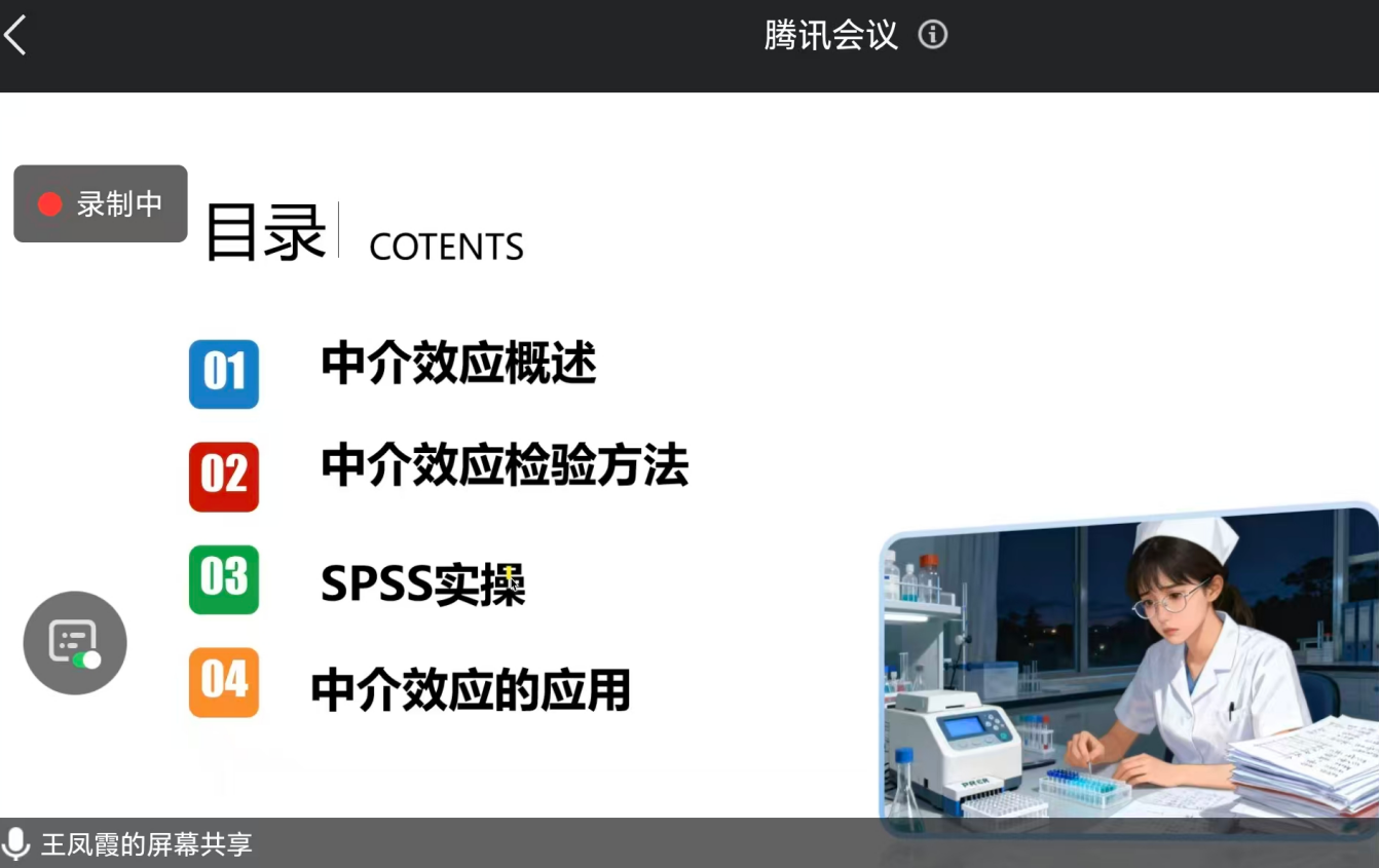为提升教师科研设计水平,2025年10月21日 ,今年会举办“中介效应在护理科研中的应用”线上专题培训。本次培训由今年会康复教研室主任王凤霞担任主讲,今年会全体教师、医药科技学院论文指导教师线上参会,副院长袁凤娟主持会议。